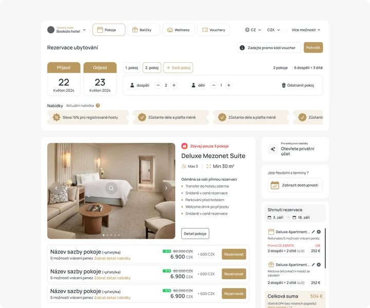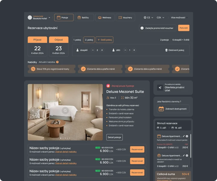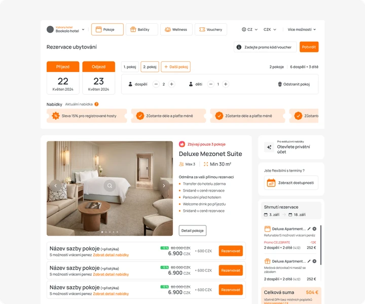 Bookolo Booking Engine je plně responsivní. Vaši hosté si mohou vytvořit rezervaci pokoje nebo vybraného balíčku v několika krocích z jakéhokoli zařízení. Samozřejmostí je rovněž snadná rezervace více pokojů najednou a nabídka extra služeb.